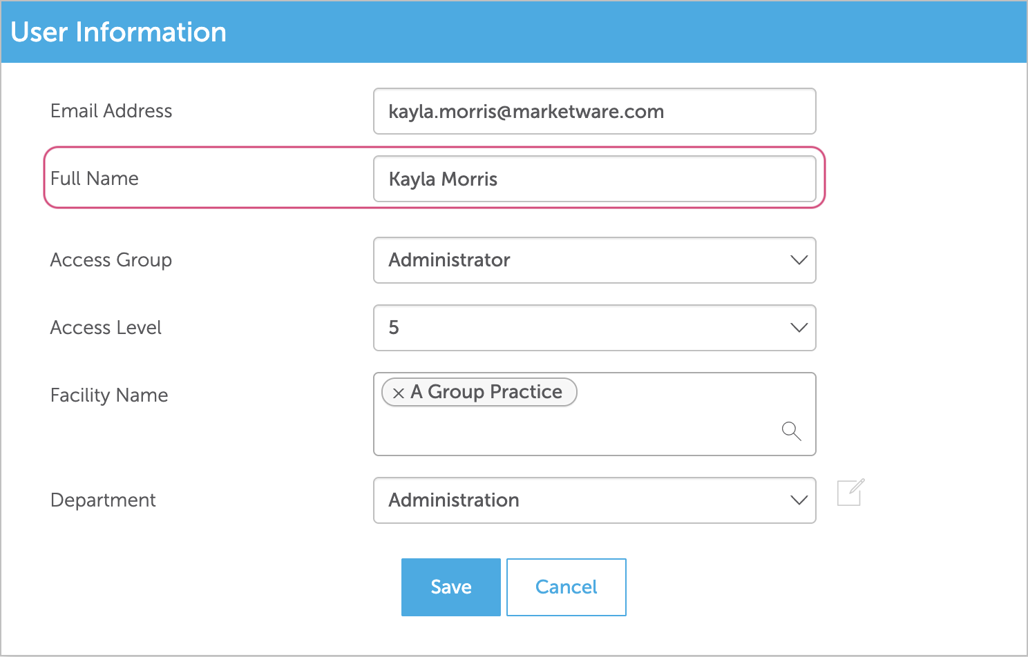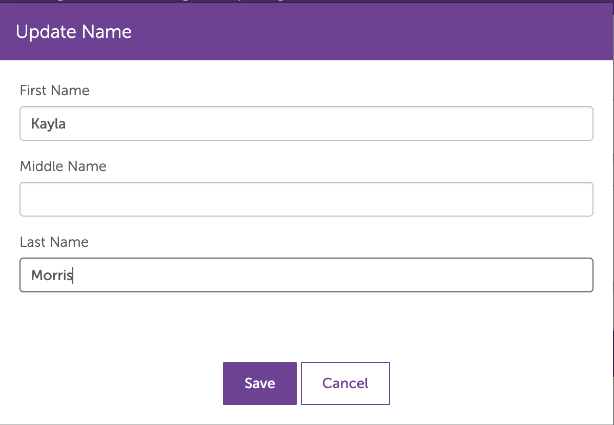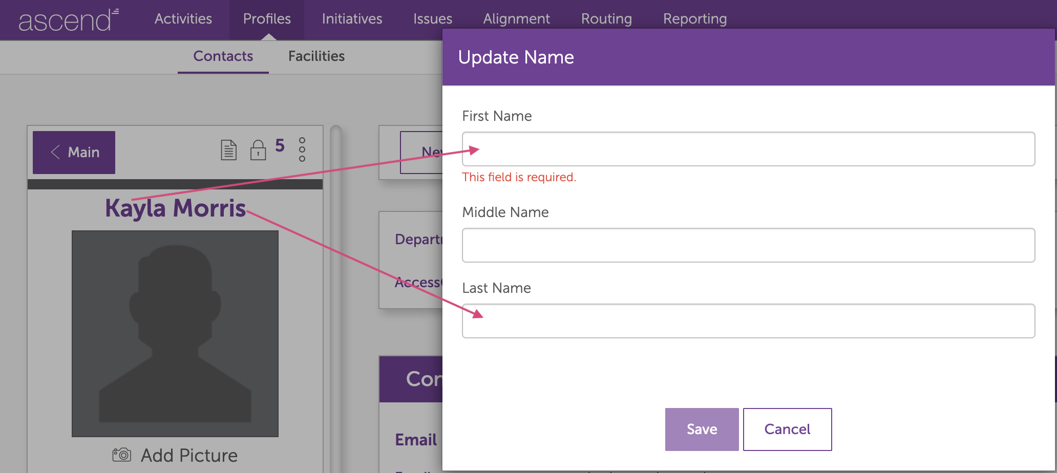 For smaller user lists, navigate to the user’s profile by searching for them in the global search. Edit the profile by clicking the name and inputting the first & last names as identified from the system settings.